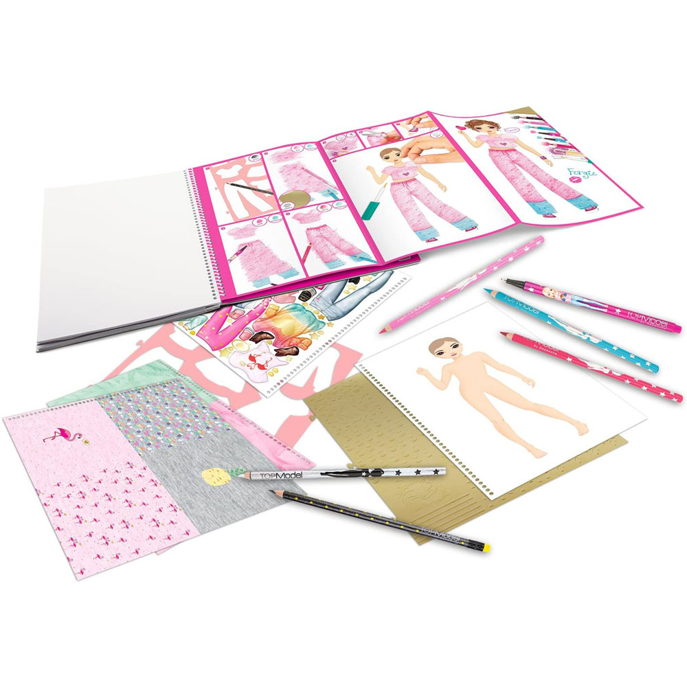 Un bel album fascinant pour la créativité avec les contours de modèles qui doivent être colorés avec des crayons, complétés d’autocollants de vêtements, ou découpez votre design de vêtements en utilisant le tissu présenté avec des ciseaux et utilisez un pochoir pour créer un motif texturé dessus.