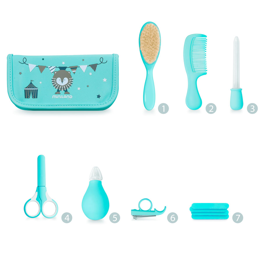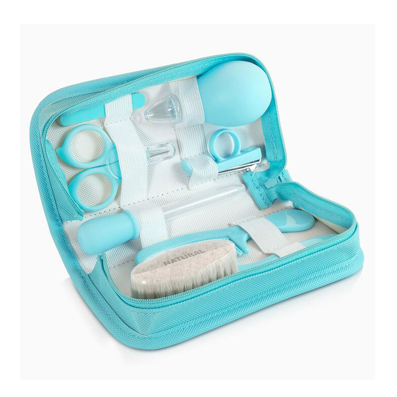 Un kit complet pour la maison et le voyage pour les soins de base de votre bébé. Il comprend une pipette, un aspirateur nasal, un peigne, une brosse à cheveux en poils naturelles, des ciseaux, un coupe-ongles et 4 limes à ongles.