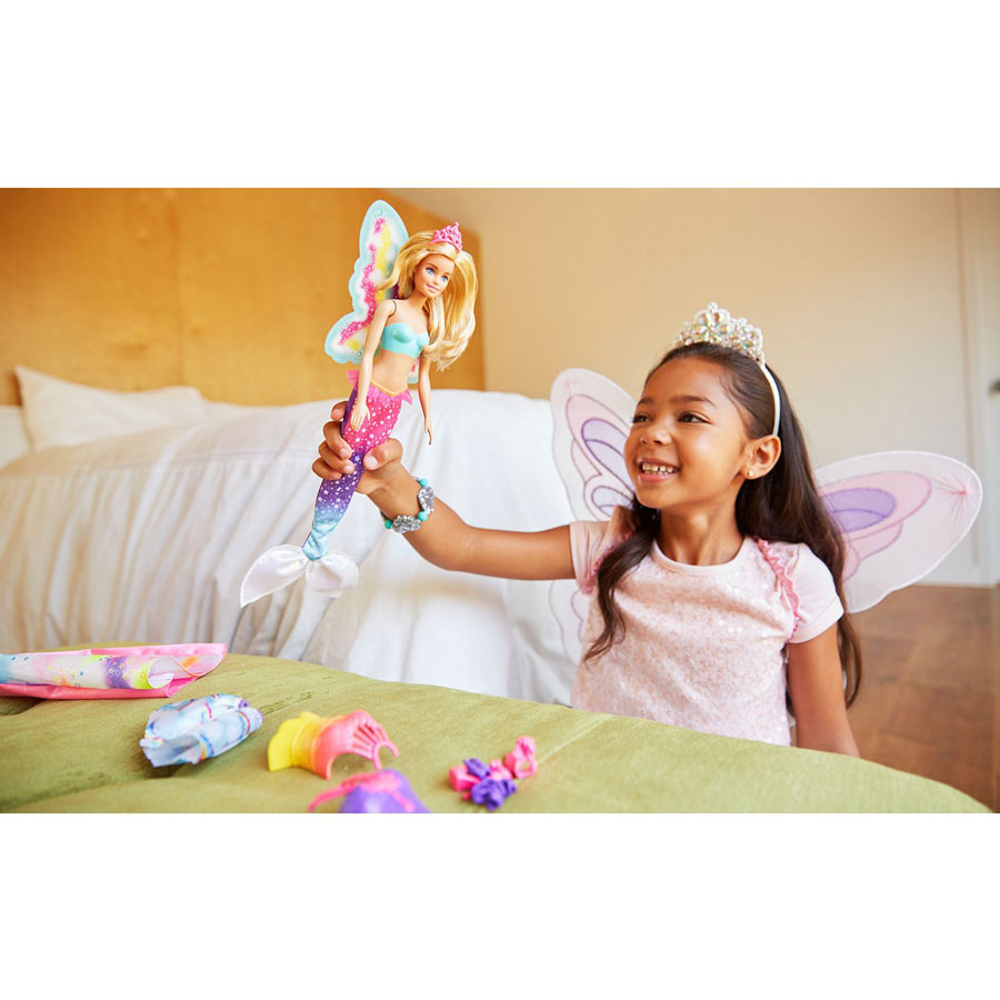 Laissez vos rêves courir, plonger et voler avec l’ensemble de poupée Barbie ™ Dreamtopia Fairytale Rainbow Cove ™ qui comprend une poupée Barbie® et trois tenues fantastiques différentes – une sirène, une fée et une princesse!