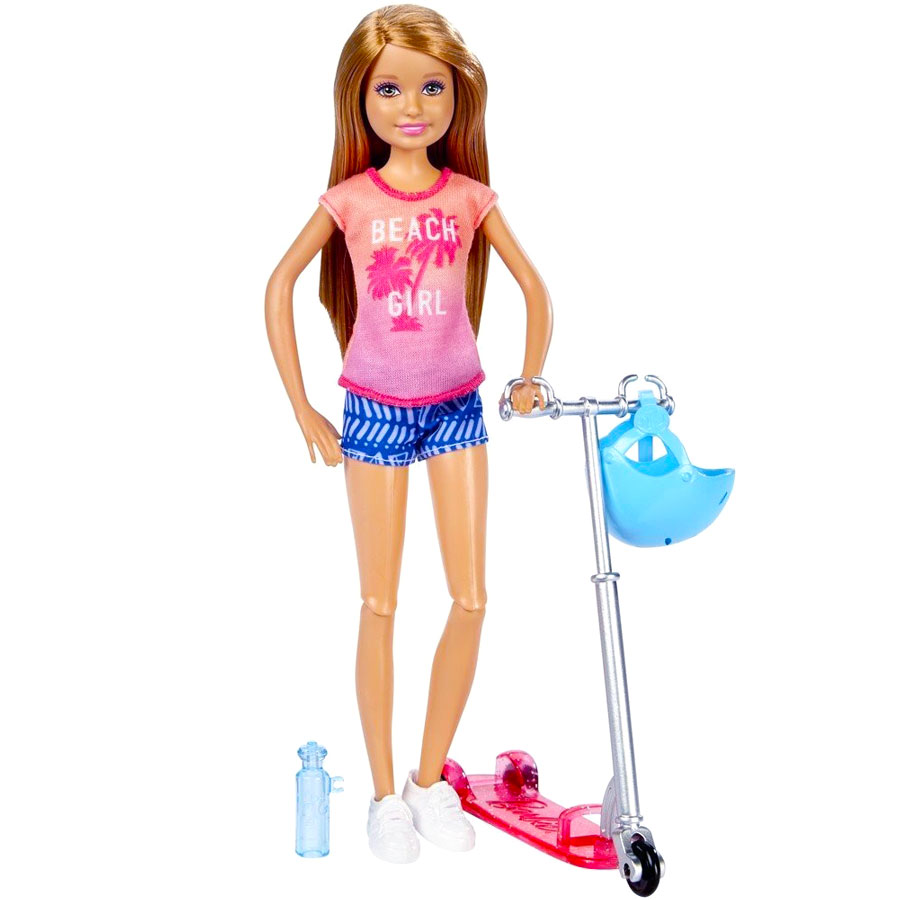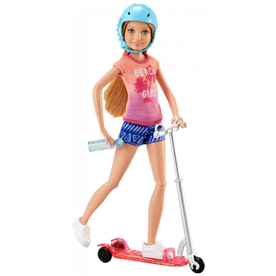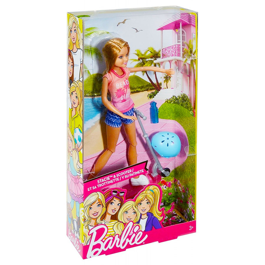 Découvrez la petite sœur de Barbie! Partez à l’aventure avec votre poupée Stacie et sa trottinette! Elle possède un châssis rose et un volant argenté. Fixez les mains de votre poupée sur le volant, posez votre pied sur la trottinette et partez. Les genoux flexibles de la poupée et les roues de scooter qui tournent ajoutent du réalisme à l’action et permettent à Stacie de montrer à tout le monde ses mouvements athlétiques. La poupée Barbie porte un T-shirt rétro dynamique, un short à motifs et des baskets blanches. Et n’oubliez pas de prendre son casque bleu et sa bouteille d’eau. Le flacon a un fermoir spécial pour que Stacie puisse boire quand elle veut.