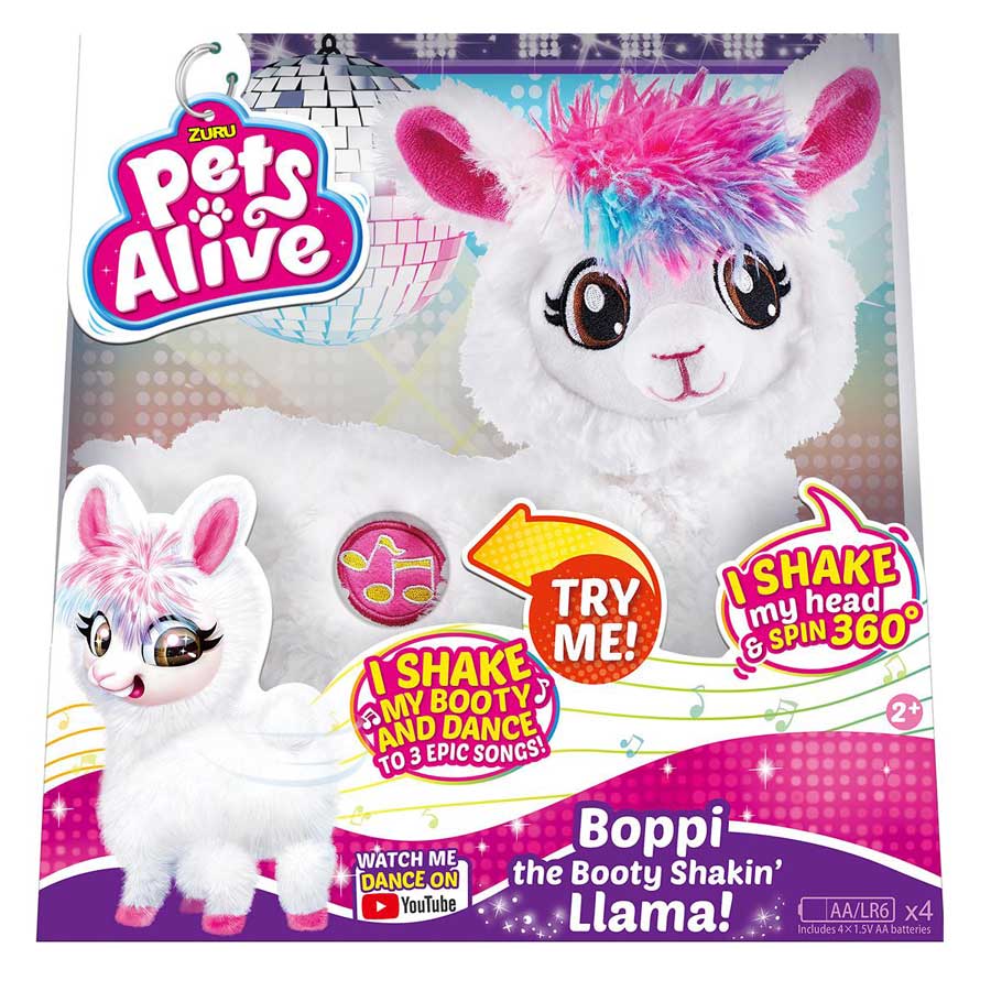 Pets Alive Boppi the Booty Shakin’ Llama est un adorable petit lama qui fera danser et rire toute la famille pendant des heures ! Il suffit d’appuyer de chaque côté du lama pour qu’il se mette à danser, remuer son derrière et secouer sa tête comme un fou ! Le lama diffuse trois chansons géniales pour chanter et danser avec lui. Adorable, hilarant et amusant pour toute la famille ! Qui aura les meilleurs mouvements sur la piste de danse, toi ou Boppi ?