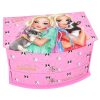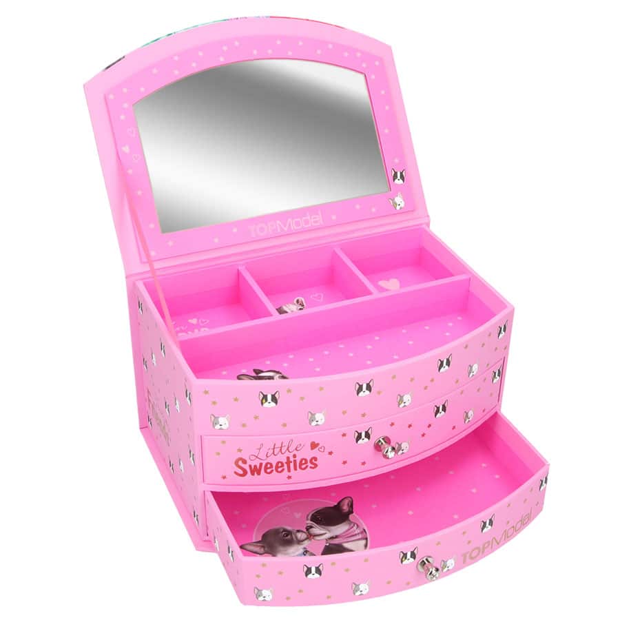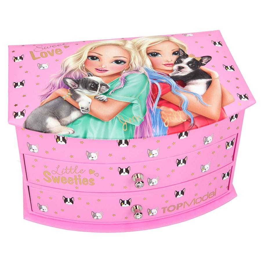 Le coffret à bijoux vient dans une couleur rose avec de jolis visages de boulldog et d’étoiles, et comporte les modèles TopModels June & Jill sur le couvercle.