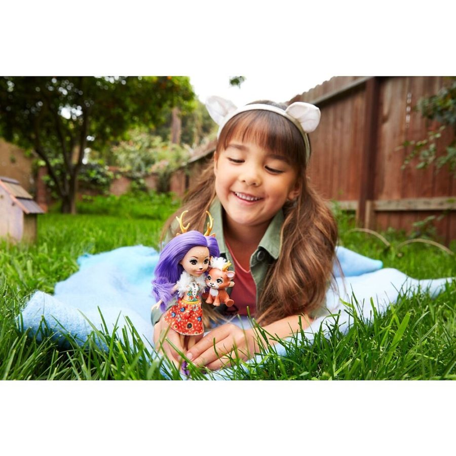 Laissez la poupée Danessa Deer et son ami cerf Sprint vous enchanter. Les poupées Enchantimals sont des personnages qui partagent un lien spécial avec leurs amis animaux – ils sont toujours ensemble, et ils se ressemblent aussi! La poupée de 15 cm (6 po) inclut Sprint, son ami cerf – tellement adorable avec ses jolis bois et son détail de fourrure adorable. La poupée Danessa Deer est vêtue d’une tenue colorée assortie à sa personnalité calme et encourageante : Elle dispose d’un corsage à imprimé floral coloré, d’une jupe amovible et d’une garniture de fourrure aux épaules. Ses chaussures ajoutent de la fantaisie, et ses bois ressortent de ses cheveux enracinés violets – elle dispose même de marquages de cerf sur son visage. Les enfants vont adorer recréer le lien spécial partagé par ces amis et célébrer un monde où «Aimer c’est tout pour nous». Collectionnez-les tous (chacun vendu séparément, selon la disponibilité) pour créer un monde des Enchantimals et raconter vos propres histoires enchanteresses. Comprend la poupée Danessa Deer Enchantimals vêtue d’une tenue et d’accessoires, et 1 ami cerf Sprint.