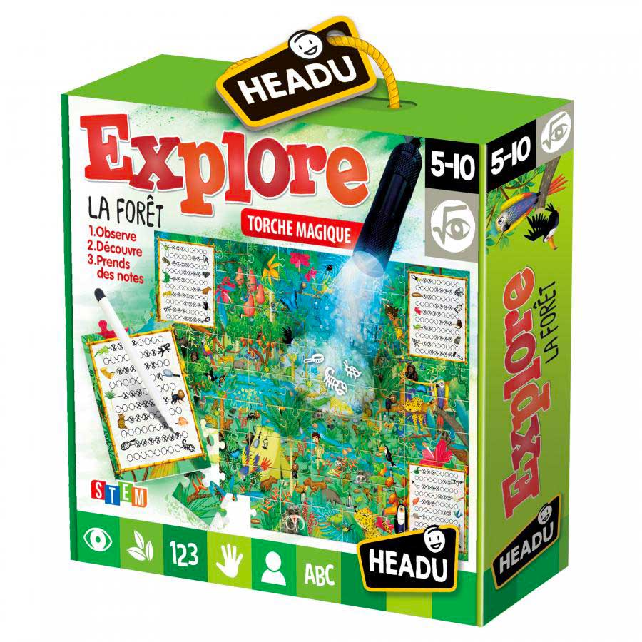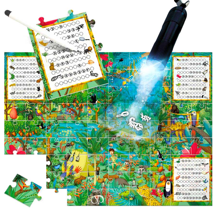 Assemble le puzzle et observe attentivement l’illustration pour découvrir le monde fascinant de la forêt. Tout comme les véritables scientifiques, tu noteras tes découvertes au fur et à mesure. Encore mieux, avec la lampe de poche magique, tu réussiras à voir ce qui n’est pas visible à l’œil nu !