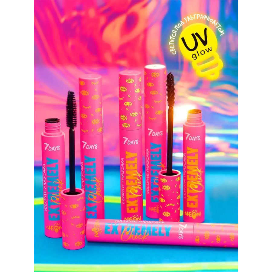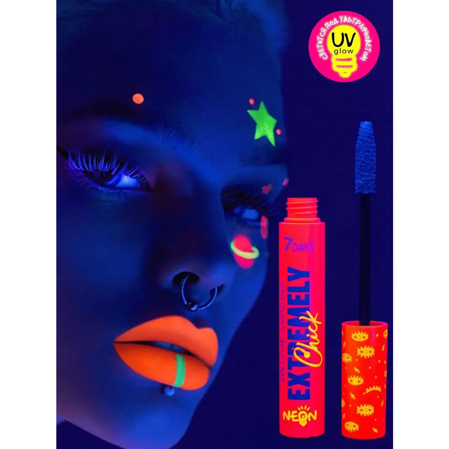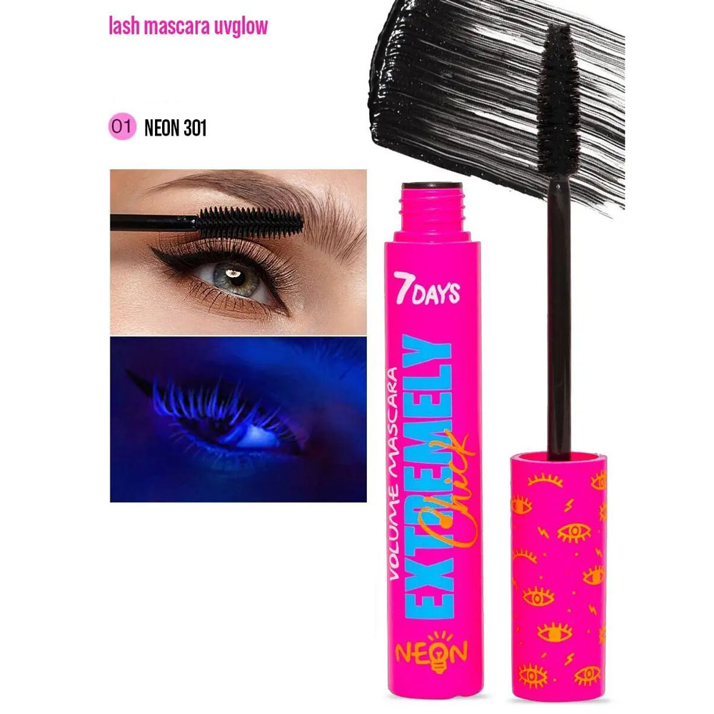 Mascara pour cils et cheveux 7DAYS noir (bleu en ultraviolet). Super volume, coloration et effet faux cils, séparation et longueur infinie. Le mascara est néon, brille dans la lumière ultraviolette, a une teinte riche et ajoute des accents lumineux à l’image. Utiliser comme mascara ou mascara cheveux. Le mascara est très résistant, ne macule pas, ne tombe pas et sèche rapidement. Le mascara lumineux est un accessoire indispensable pour une fête, une séance photo, un concert, une performance. Vos yeux et vos cils séduiront par leur expressivité. Mascara pour le maquillage de jour et de soirée en noir, cils volumineux, allongeant et recourbés, longue tenue et séparant.