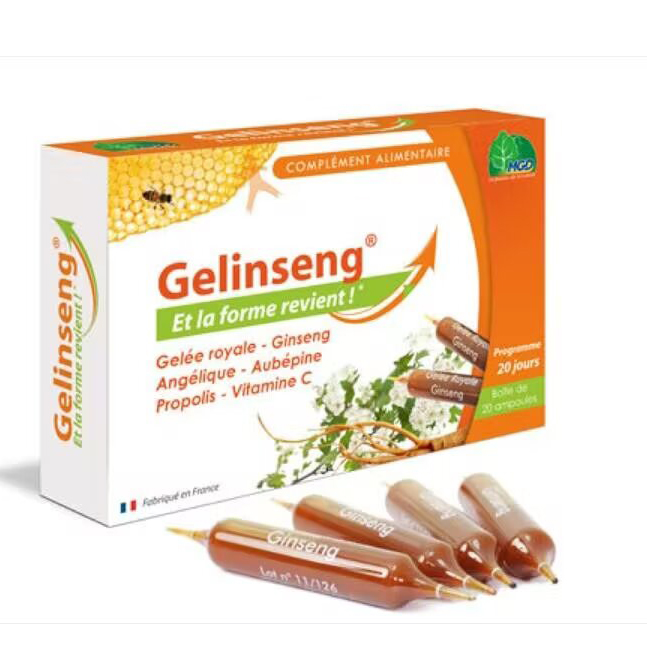 Présenté sous forme d’ampoules, Gelinseng® est un véritable concentré de nutriments qui allie des produits issus de la ruche (miel, propolis, gelée royale), des extraits végétaux (ginseng, angélique et aubépine) et de la vitamine C.