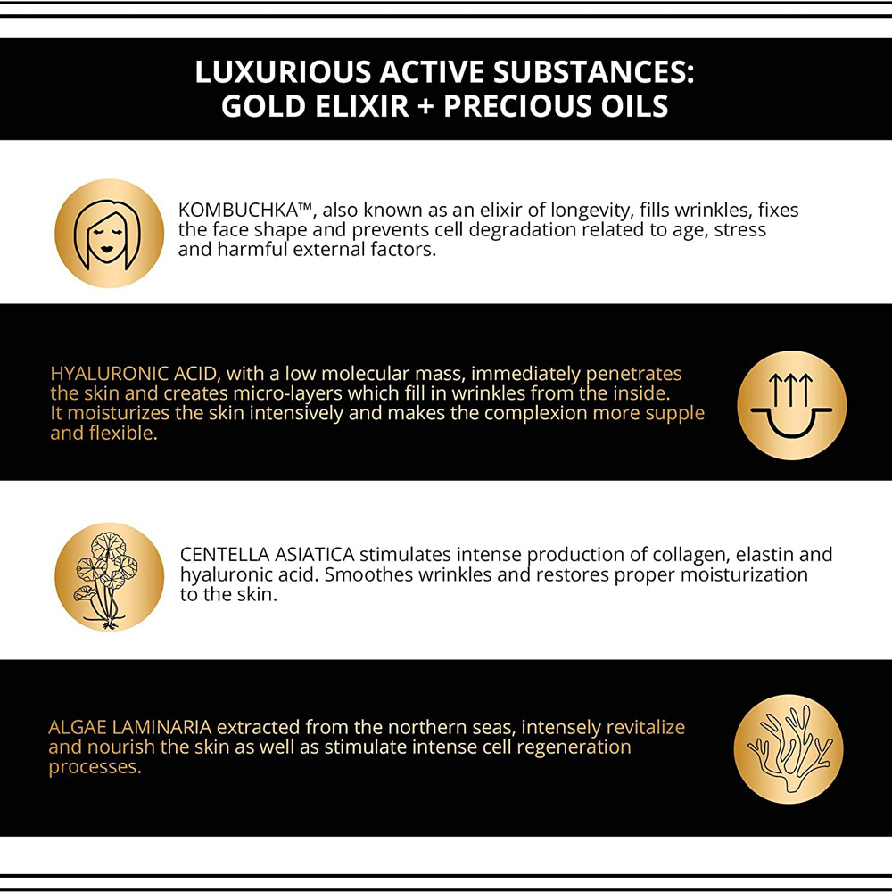 Ingrédients actifs avancés également trouvés dans la crème todrobinki pure or 24 carats, KombuchkaTM, huile d’inca inchi, huile de macadamia, huile d’amande.