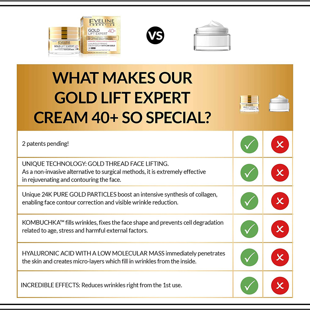 La luxueuse crème-sérum ultra-raffermissante 40+ retend et raffermit fortement la peau. La crème Gold Lift Expert est conçue pour les peaux très matures, sèches et sensibles. Le contenu des formules Anti-Age intenses stimule un lifting multifacette.