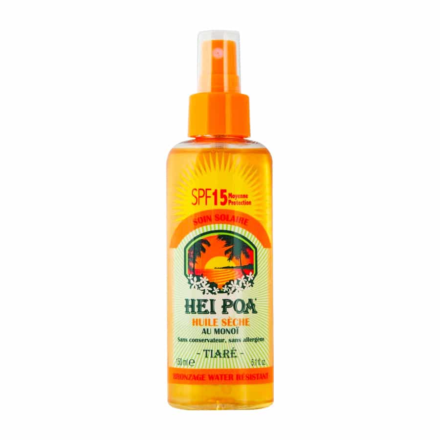 l’Huile Sèche au Monoï SPF15 protège efficacement la peau des rayons du soleil (UVA et UVB). Enrichie en Monoï de Tahiti, cette huile sèche au fini soyeux hydrate, nourrit et laisse un fini satiné sur la peau. La peau est délicatement parfumée aux fleurs de Tiaré. Water-résistant.