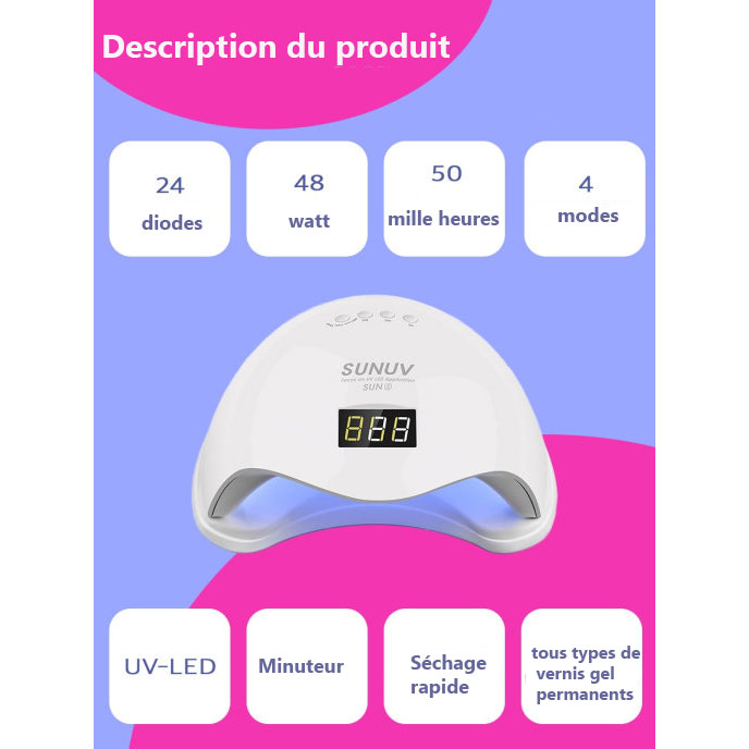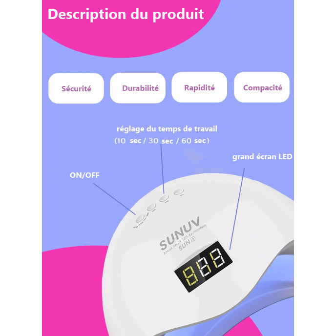 Polymérisation de toutes sortes de vernis permanent et gels à ongles. Lampe de nouvelle génération avec technologie LED à double spectre.