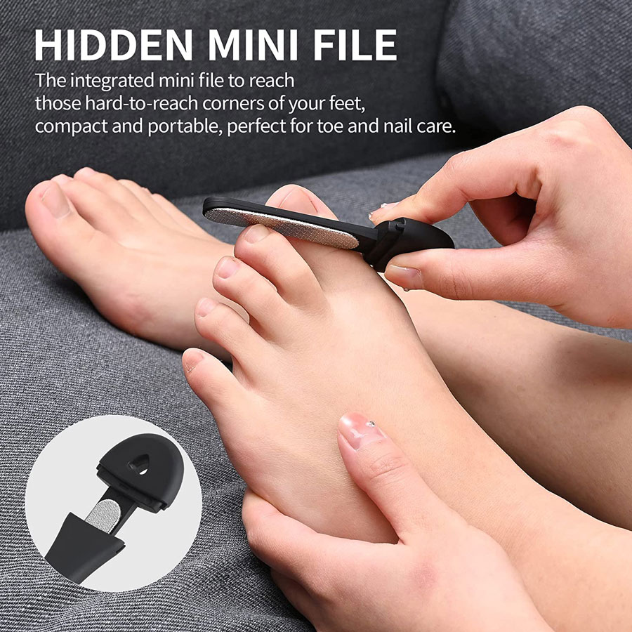 La lime à pieds possède 2 surfaces de travail avec un côté rugueux et doux + une lance rétractable sur le manche pour un soin minutieux entre les doigts et les ongles.