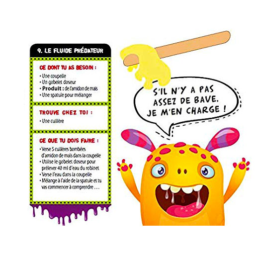 Contient: Des lunettes et des gants de protection, des pipettes Pasteur, des spatules en bois, des spatules en plastiques, de l’amidon de maïs, de la gomme de guar, du chlorure de calcium, de l’alginate de sodium, du colorant jaune, des bouteilles avec des bouchons de sécurité, des gobelets doseurs, des coupelles rondes, des éprouvettes, un manuel illustré.