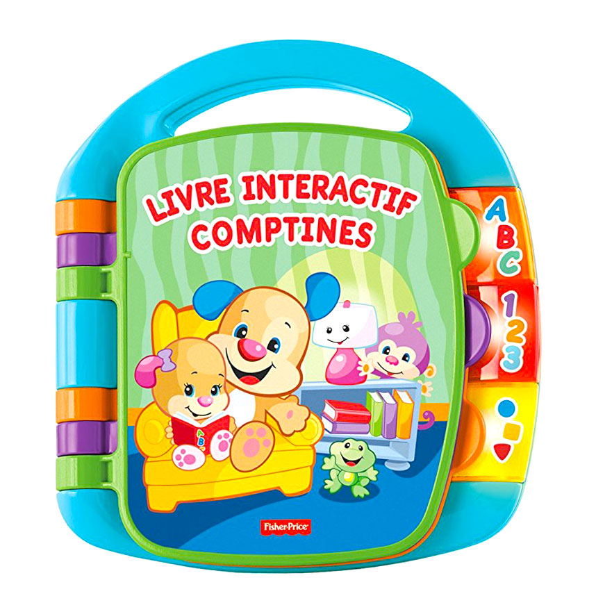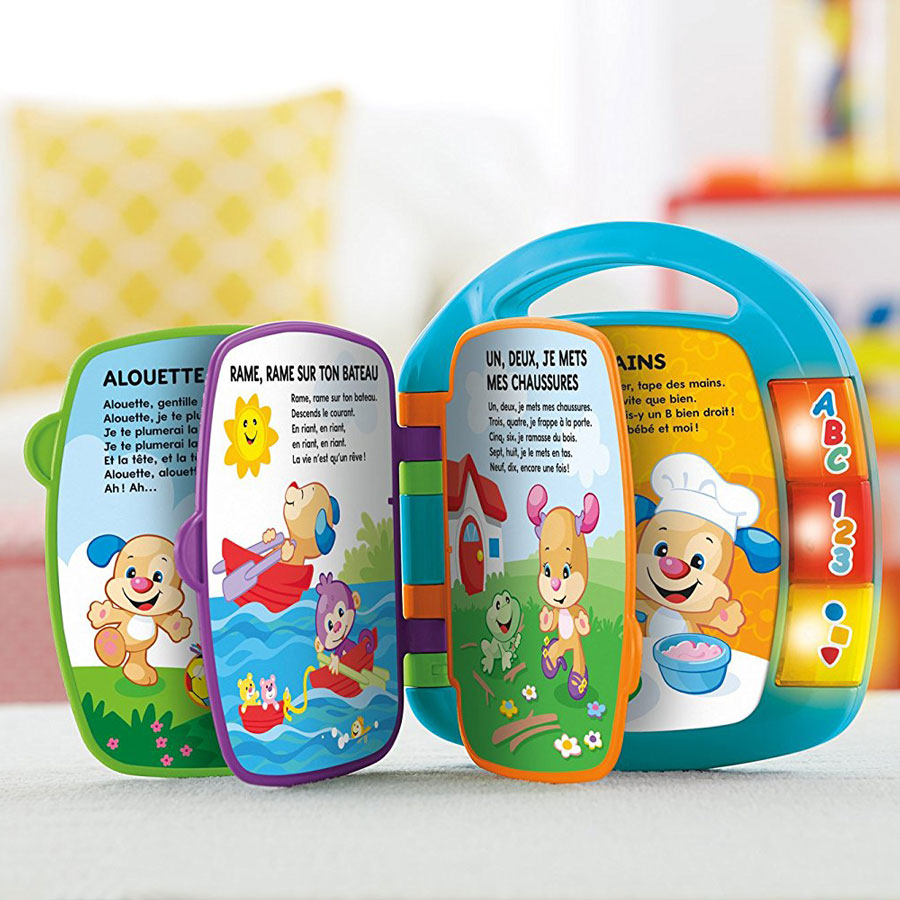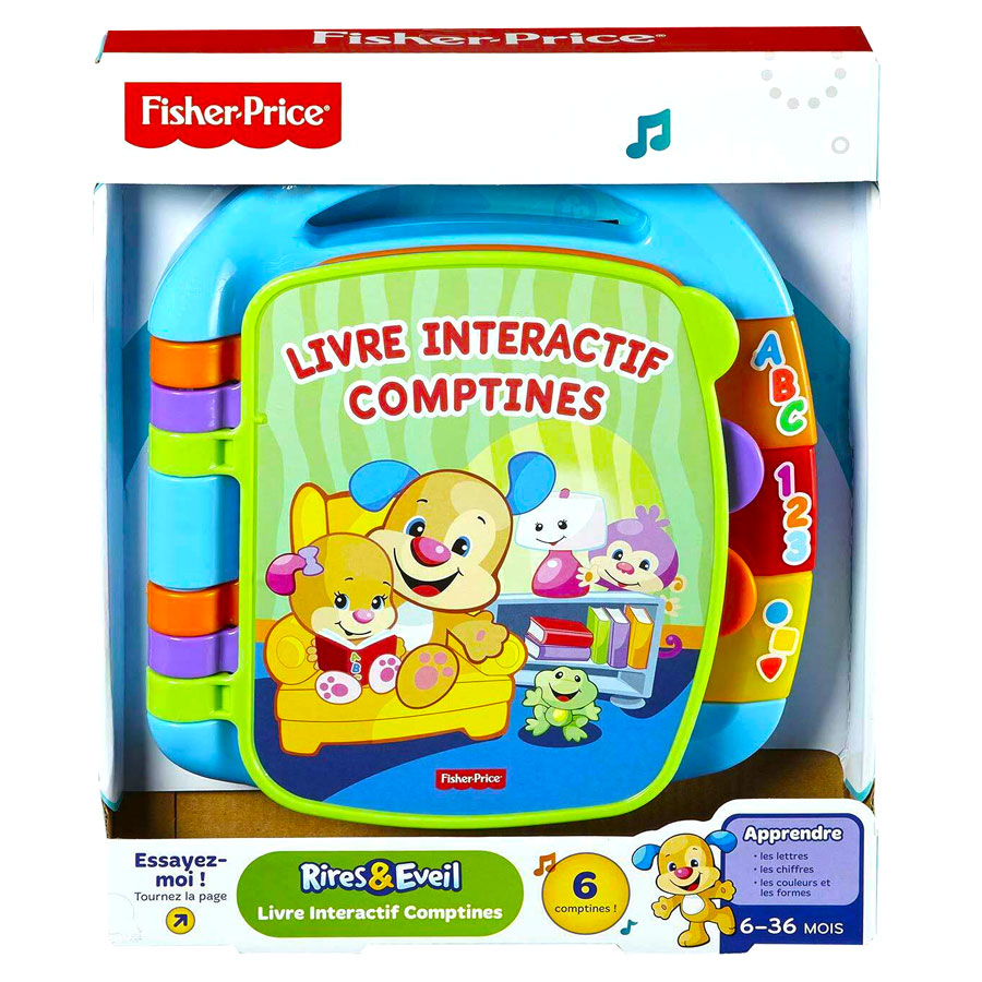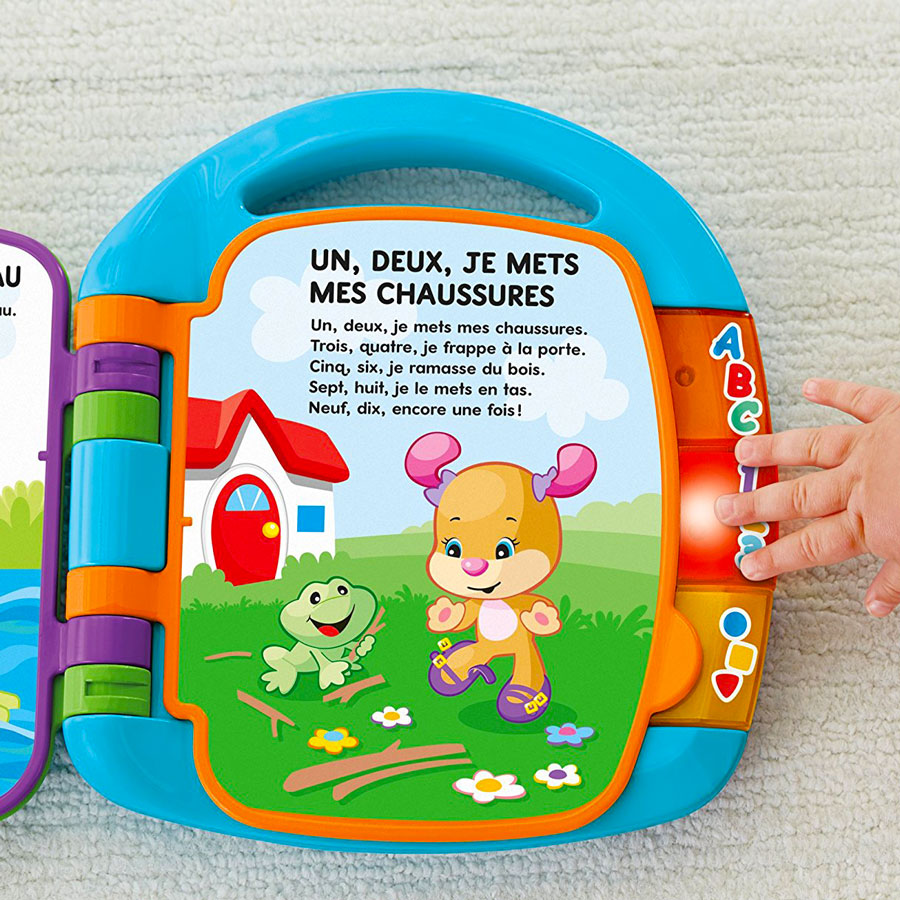 Bébé va apprendre et s’amuser grâce au Livre Comptines Interactif Rires & Éveil! Il suffit de tourner les pages pour entendre des chansons comme « Tape des mains » ou « Rame, rame sur ton bateau », et découvrir des illustrations colorées mettant en scène Puppy et Sis! Pendant que vous et votre enfant sautillez au rythme de la musique, il apprend à compter et découvre les premiers mots, les lettres, les chiffres, les formes et plus encore! Et grâce à une poignée pratique pour le transport, vous pouvez emmener le livre partout avec vous!