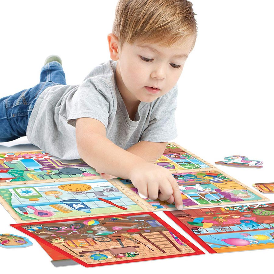 Range tous les objets à leur place et construis une merveilleuse maisonnette ! Grâce à ce jeu, l’enfant apprend à catégoriser les objets, à reconnaître leur forme et à les insérer au bon endroit.