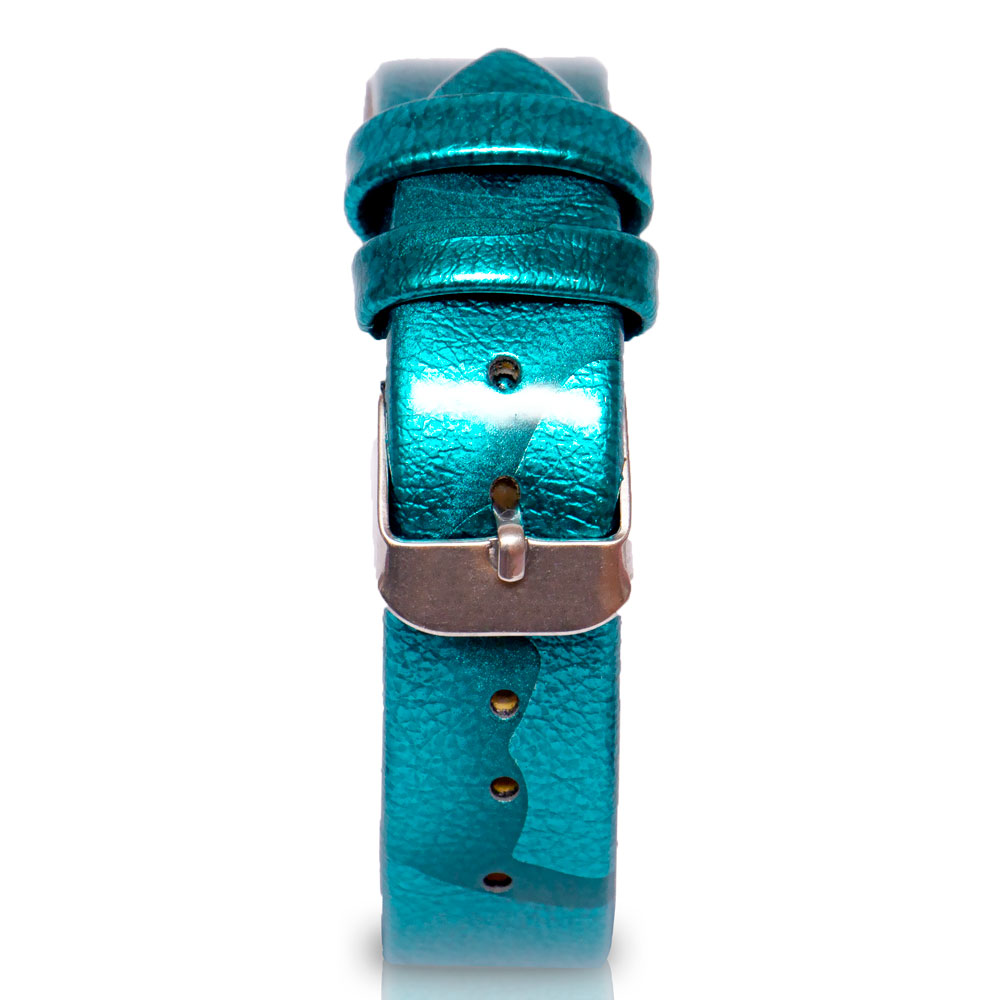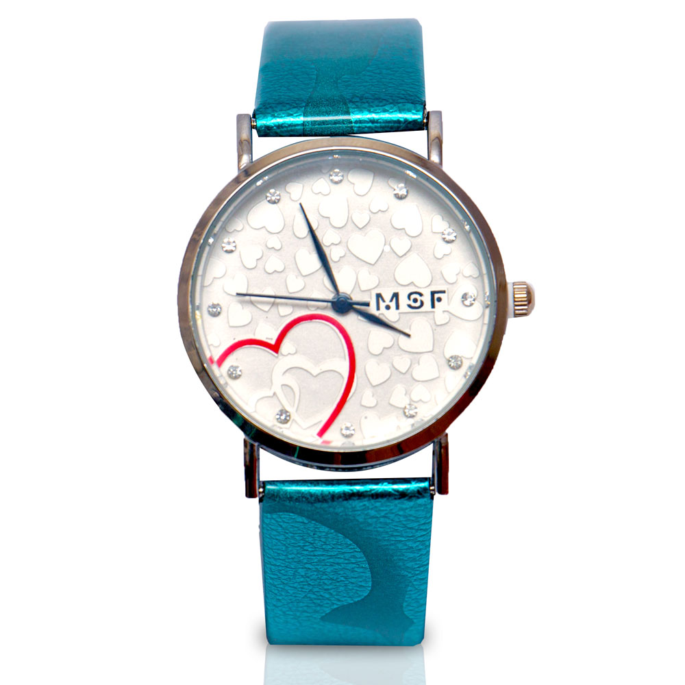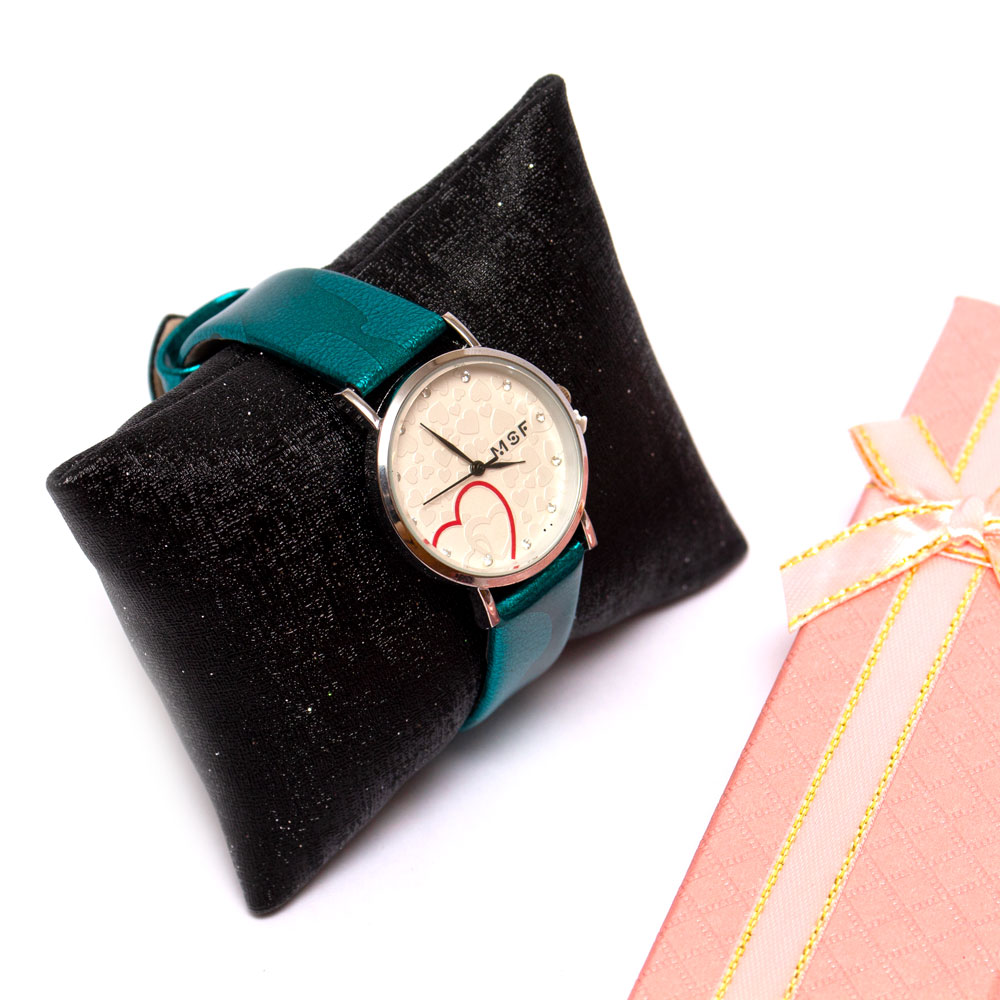 Montre élégante et originale avec des cœurs sur le cadran et un bracelet en cuir laqué. Cette montre sera un bel ajout à votre tenue.