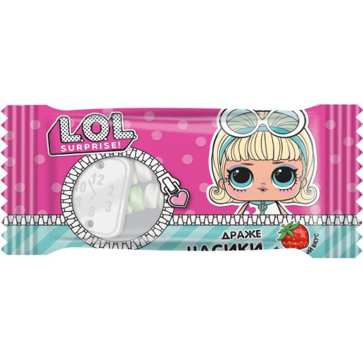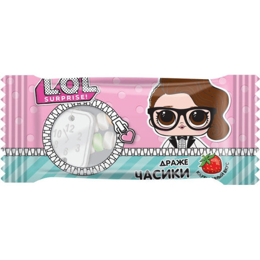 Collier dragée sur ficelle en forme de « Montre », emballé en flowpack. Dragée jaune, verte, blanche, goût – fraise. Le cadran est une dragée en forme de montre. 2 modèles d’emballage.