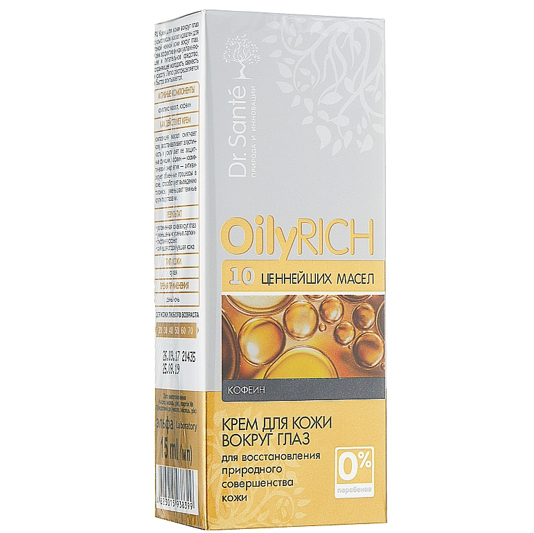 Pour prendre soin de la peau délicate des paupières, la crème contour des yeux Oily Rich Dr.Sante est parfaite. Cette crème est conçue pour être utilisée de jour comme de nuit. Contient de la caféine et un complexe des dix huiles les plus précieuses. Peut être utilisé à tout âge.