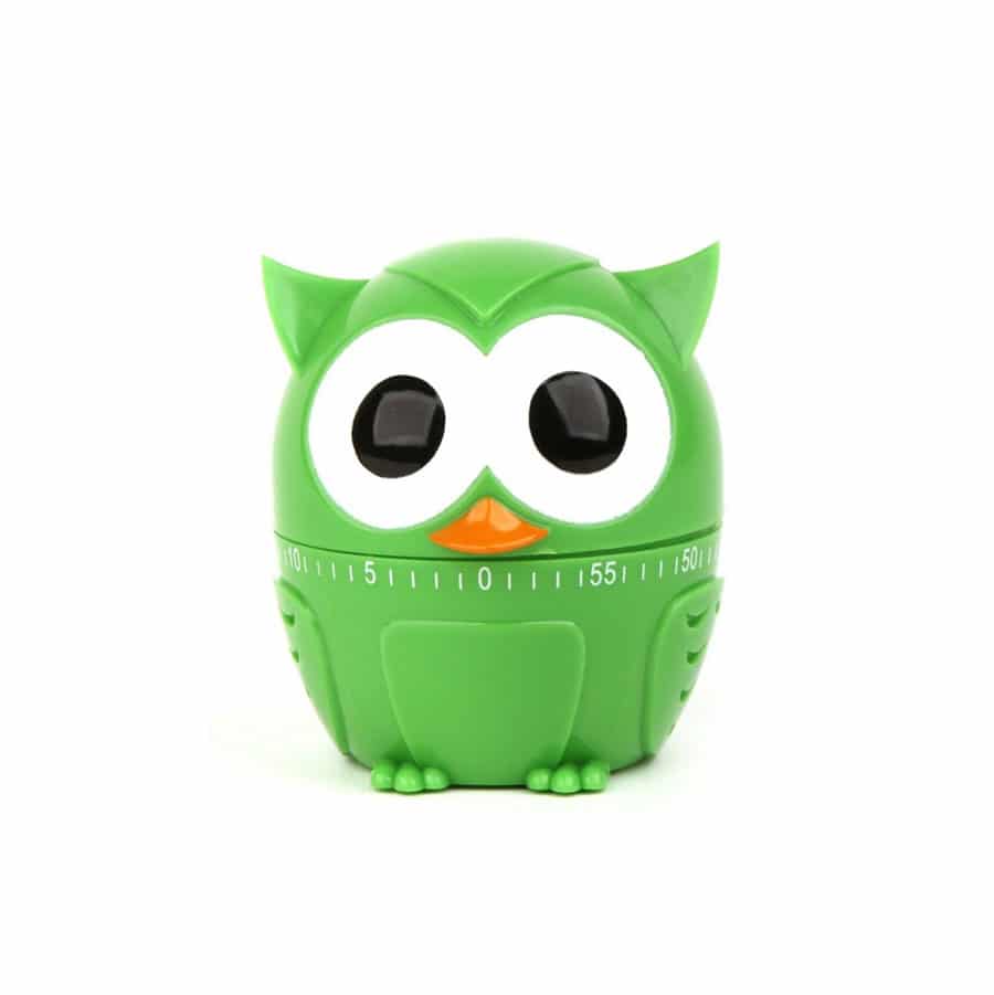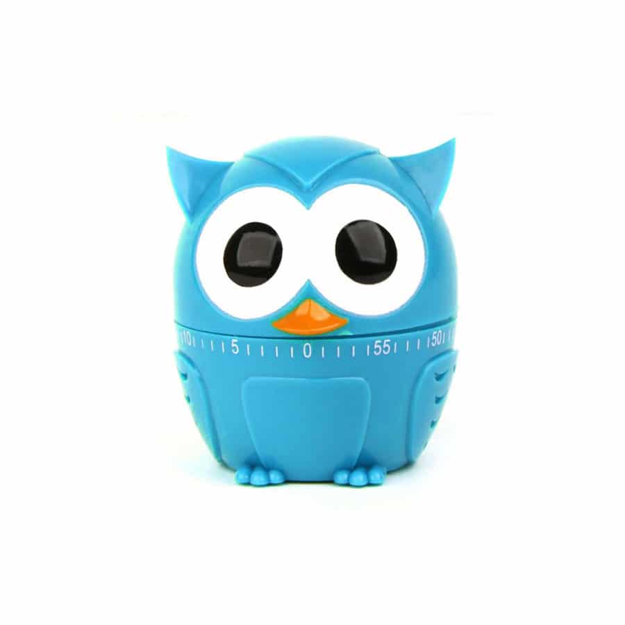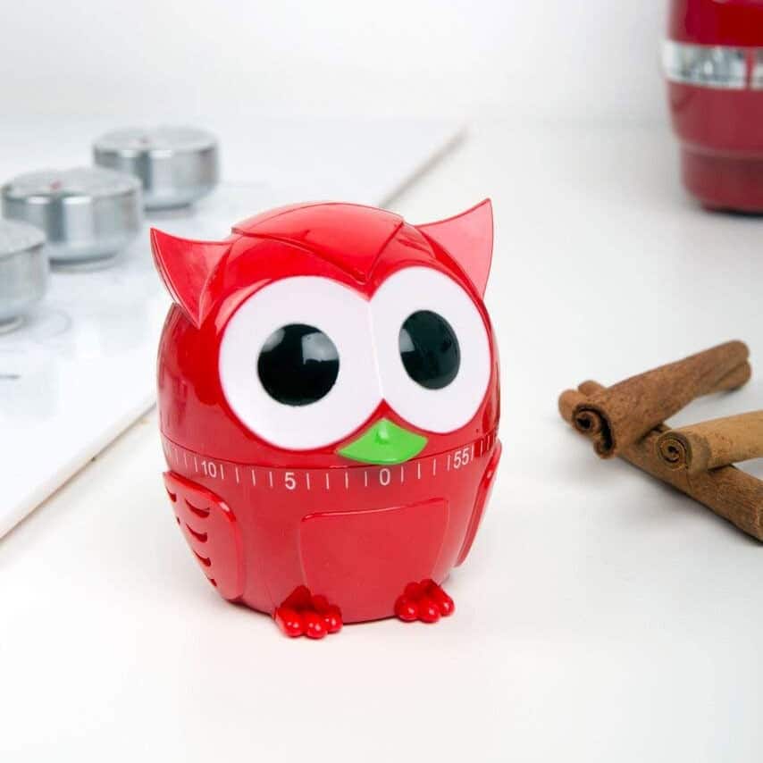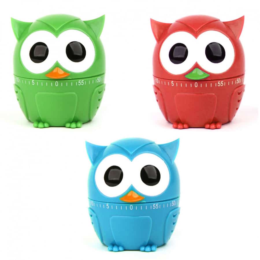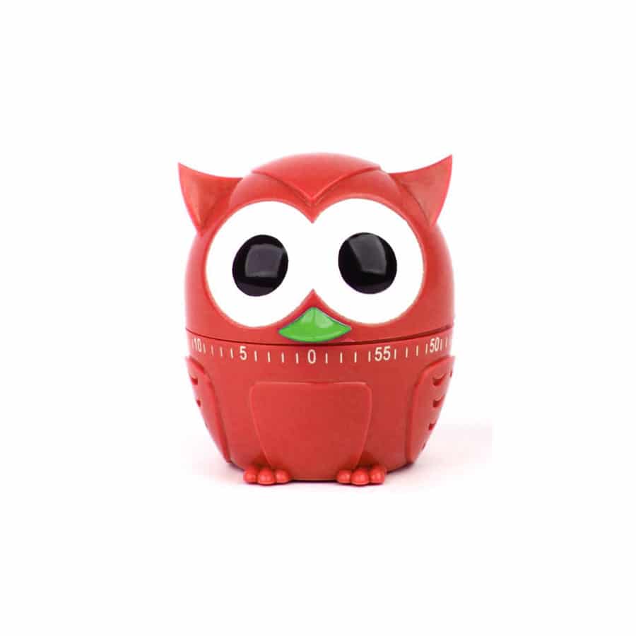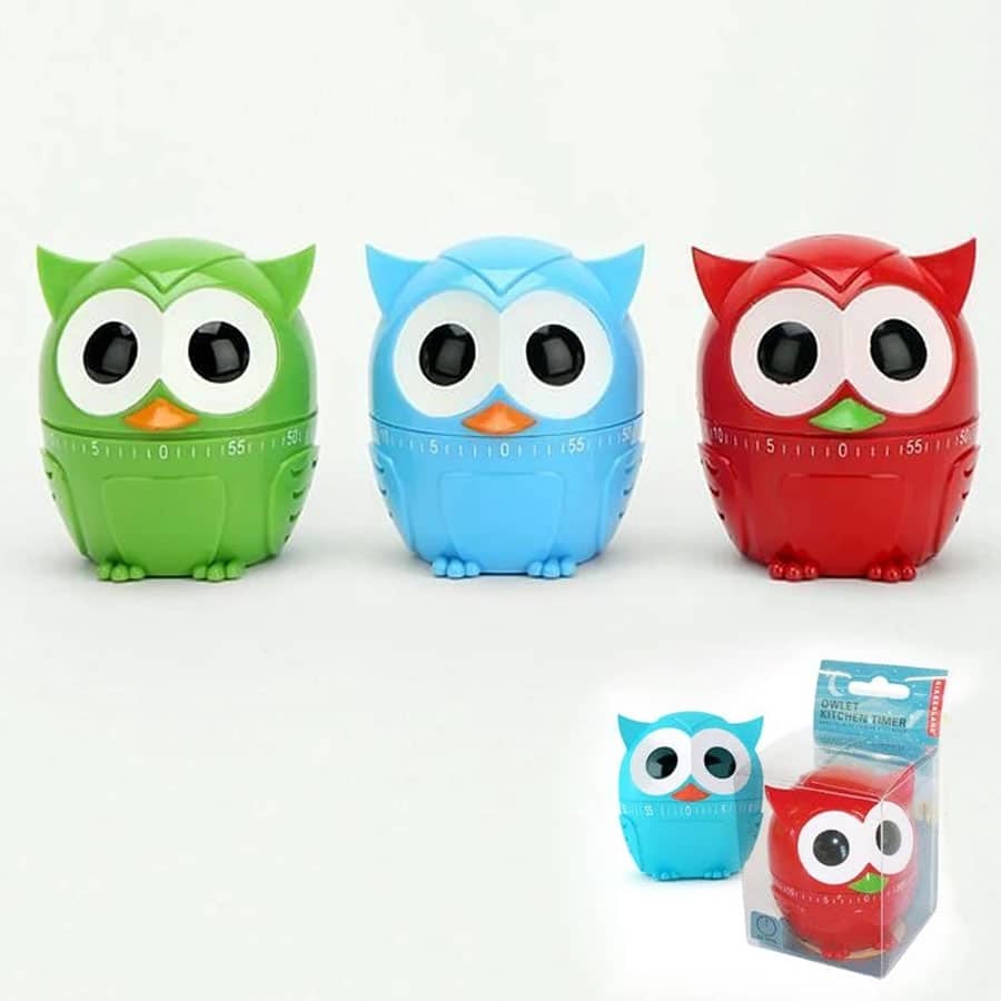 Une minuterie de cuisine adorable sous forme d’un hibou aux yeux écarquillés surveillera et chronométrera vos recettes pour les rendre parfaits. Tournez la tête du hibou pour régler l’heure. Minuterie va jusqu’à soixante minutes. Mécanisme en acier avec extérieur en plastique et pieds en caoutchouc. Assortiment de couleurs rouge, vert et bleu ciel.