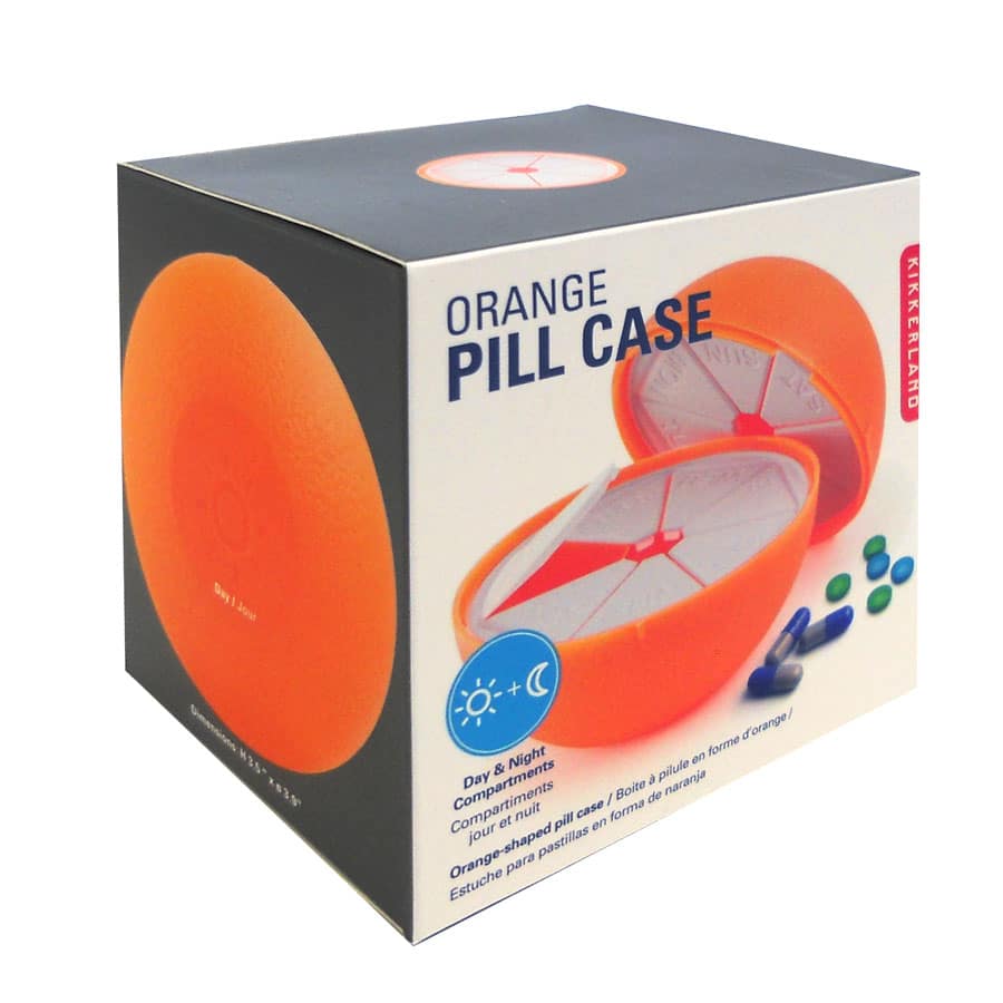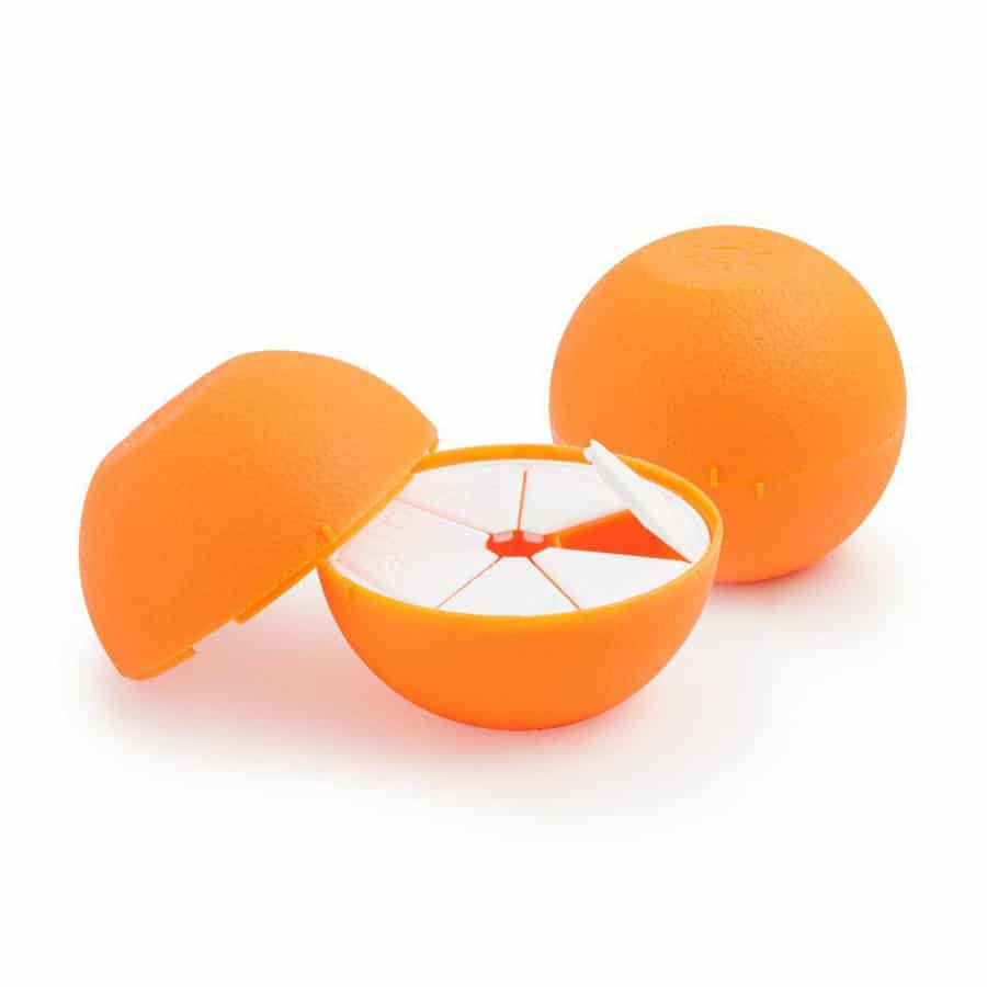 Boite pilulier en forme d’orange. Compartiments jour et nuit.