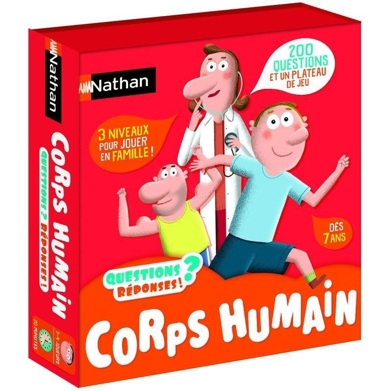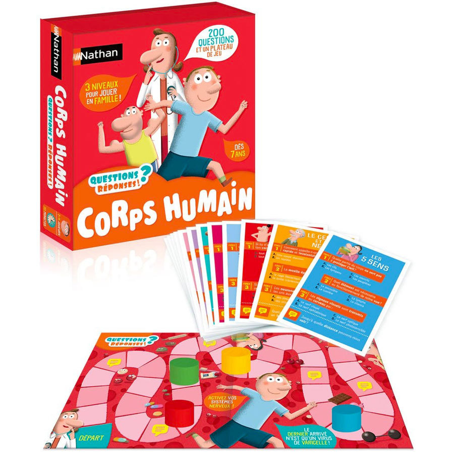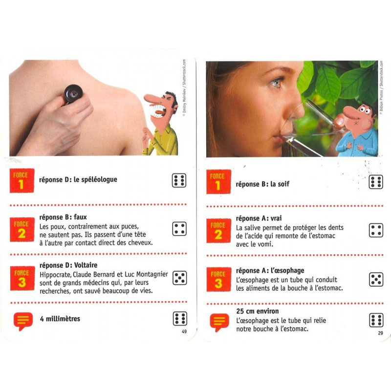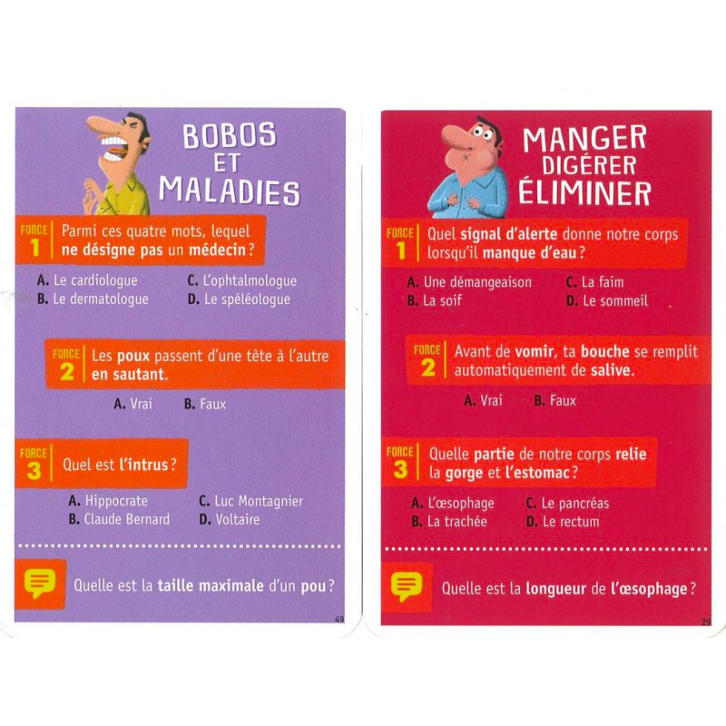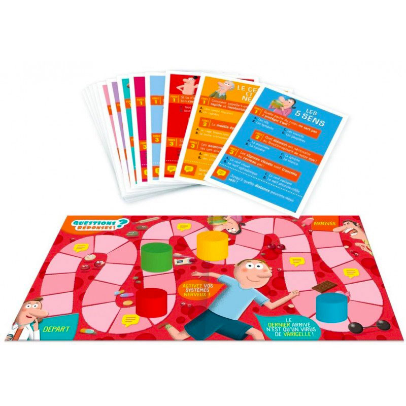 Jeu de devinettes sur le thème du corps humain. Chaque joueur à son tour pioche une carte et lit à haute voix une question. S’il sait y répondre, il avance son pion du nombre de cases indiqué à côté de la réponse. Si le pion du joueur est sur une case spéciale, on pose alors la question ouverte à tous les joueurs. Celui qui a donné la réponse la plus proche fait avancer son pion. Trois niveaux de question permettent d’adapter le jeu à l’âge des joueurs.