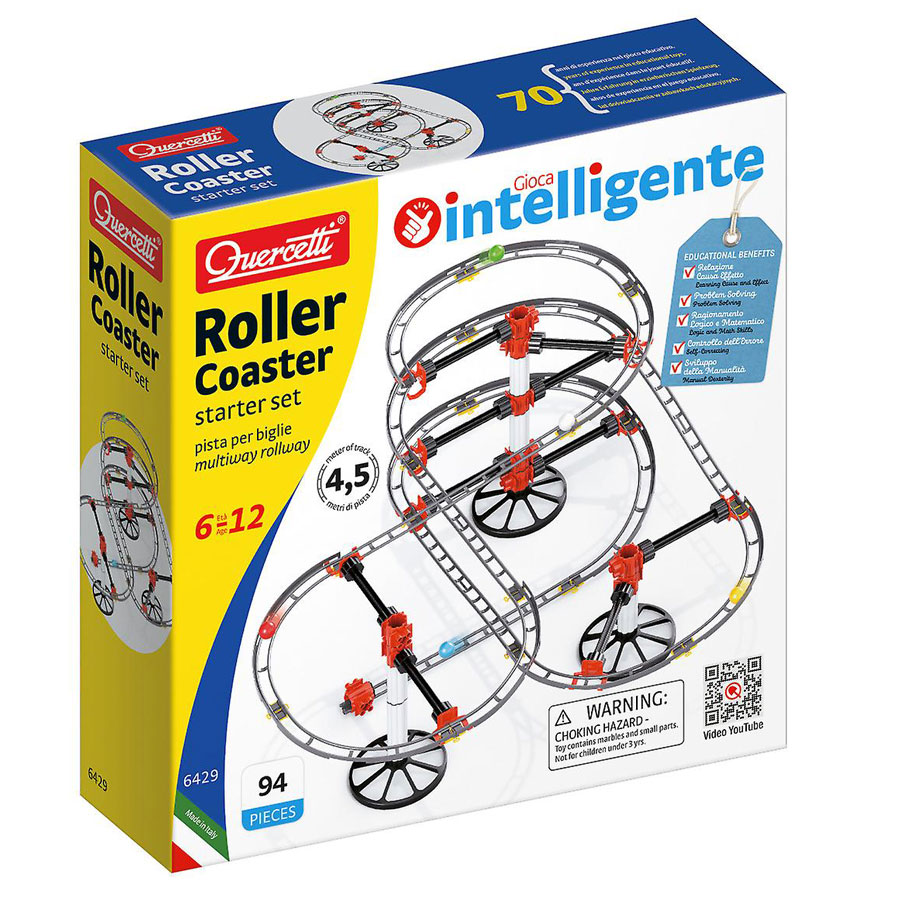 Avec le kit de montagnes russes Roller Coaster, vous pouvez construire de superbes pièces de suspension en marbre jusqu’à 1,5m de long! Cet ensemble de montagnes russes a été soigneusement conçu pour utiliser des billes de différentes tailles et matériaux. Il vous permet de faire des observations, des expériences et des découvertes intéressantes dans le monde de la physique (vitesse, gravité, force, centrifugeuse, attrition) et de comprendre intuitivement les principes de base. Le Quercetti Roller Coaster Starter Set est un moyen sûr de passer des heures de plaisir, tout en apprenant. Convient aux enfants de plus de 6 ans. Contenu: 13 voies courbes 5 voies droites 3 plates-formes 10 supports et jonction 17 connecteur de voie 5 marbre 16 piliers / tuyau / vertical 24 connecteur 1 manuel d’utilisation avec des exemples.