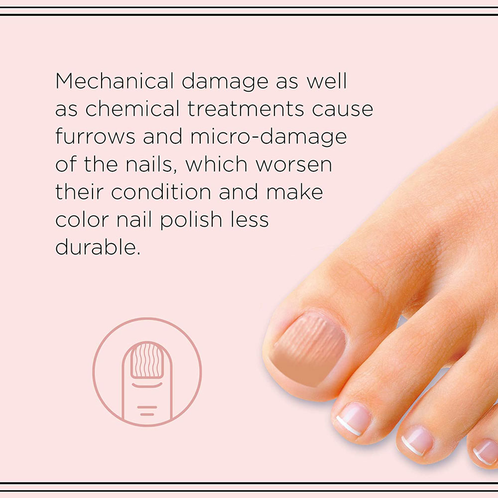 Traitement anti-taches pour ongles des orteils : le produit crée une couche protectrice sur la plaque de l’ongle contre les dommages mécaniques. Le soin améliore visiblement l’aspect des ongles, et illumine la plaque de l’ongle.