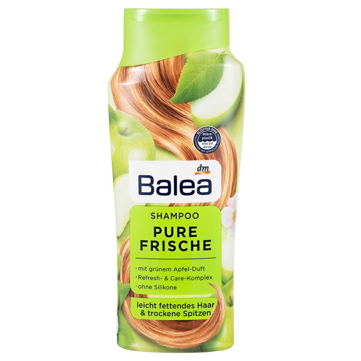 Balea Pure Frische Shampooing pour cuir chevelu gras et cheveux secs au parfum de pomme verte. Le shampooing nettoie en douceur mais en profondeur les cheveux. Régule l’équilibre eau-graisse, élimine l’excès de graisse, sans dessécher les cheveux. Donne aux cheveux un éclat et une brillance éclatants sur toute la longueur jusqu’aux pointes. La formule douce nourrit vos cheveux et les rend merveilleusement élastiques, grâce au complexe avec la vitamine B3 et la provitamine B5. Sans silicone ni microplastique.
