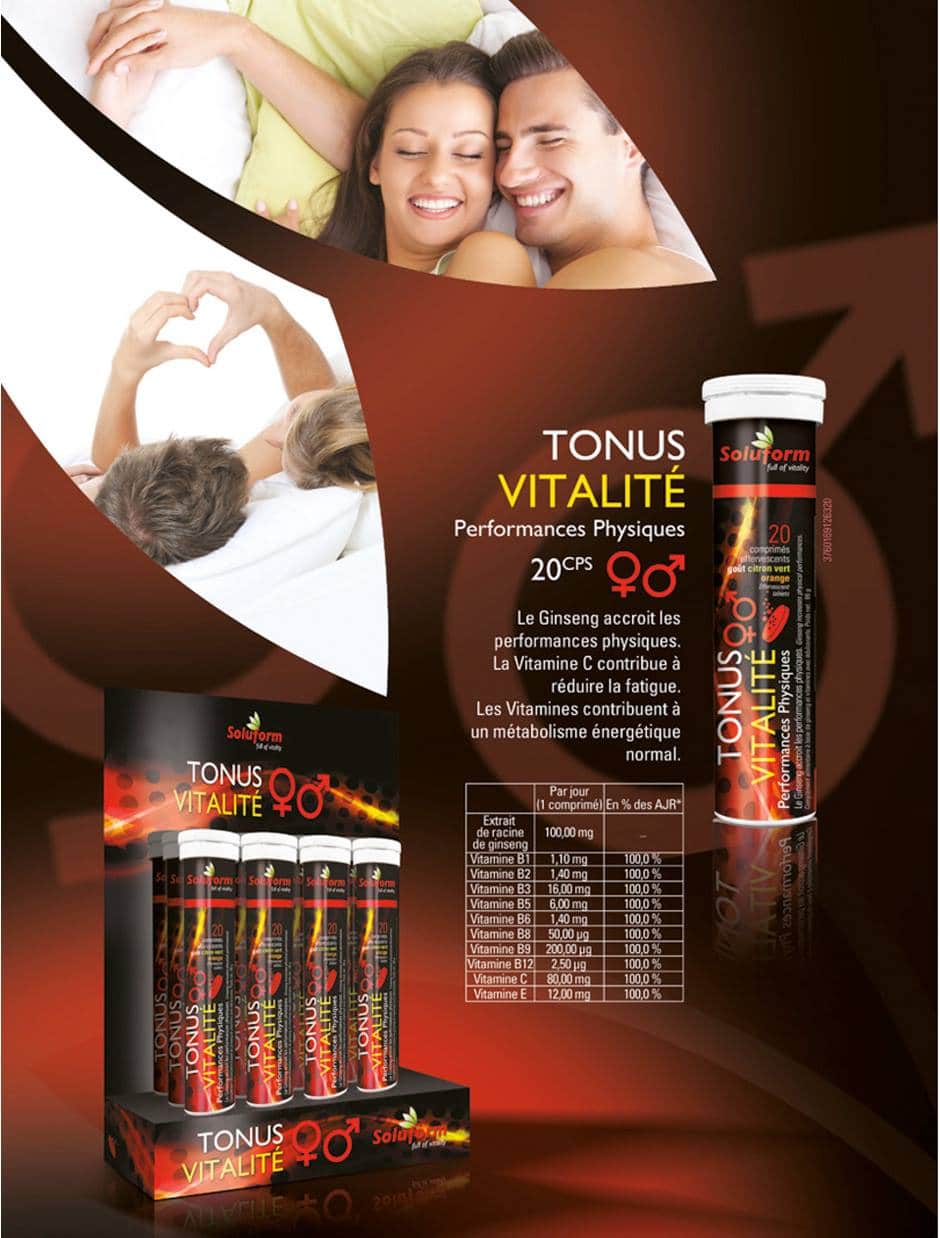L’action de Soluform Tonus Vitalité est due aux propriétés des composants qui le composent: Extrait de racine de ginseng, Vitamines B1, B2, B3, B5, B5, B6, B8, B9, B12, Vitamine C, Vitamine E.
