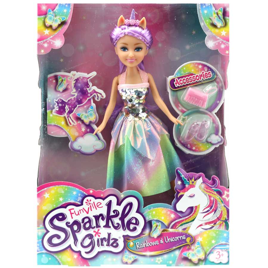 ZURU Sparkle Girlz Deluxe Unicorn Princess est une magnifique poupée pour inspirer la fantaisie et l’imagination! Montez dans le royaume étincelant où elle règne avec couleur et joie. Elle aime passer du temps à peindre des arcs-en-ciel et à caracoler sur les nuages. Ses cheveux longs sont incroyables à brosser et à coiffer! Avec une tenue colorée et brillante qui peut être interchangeable avec d’autres poupées Sparkle Girlz et d’autres vêtements. Collectionnez les quatre ensembles de licorne et d’arc-en-ciel super brillants!