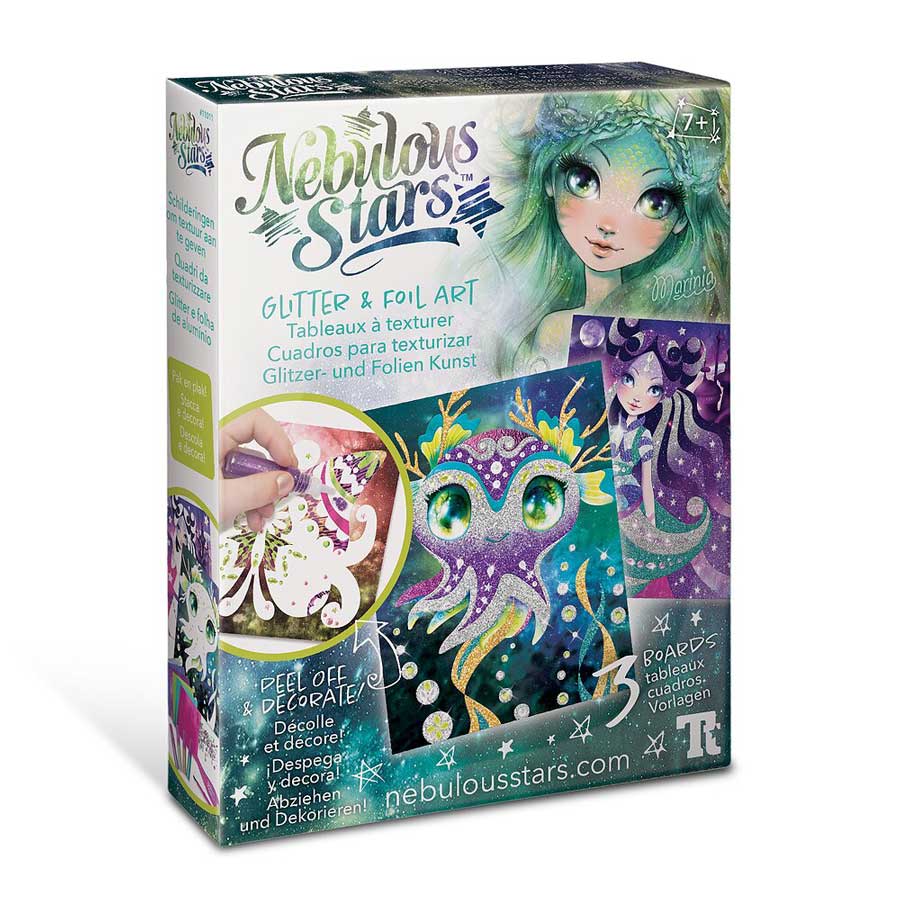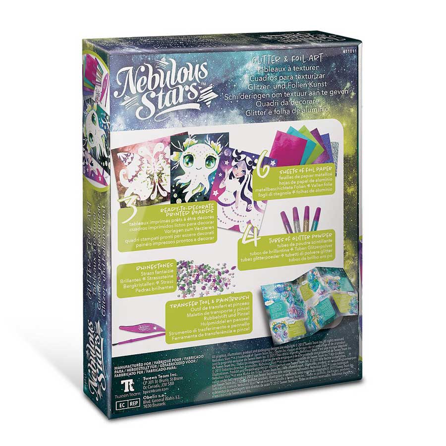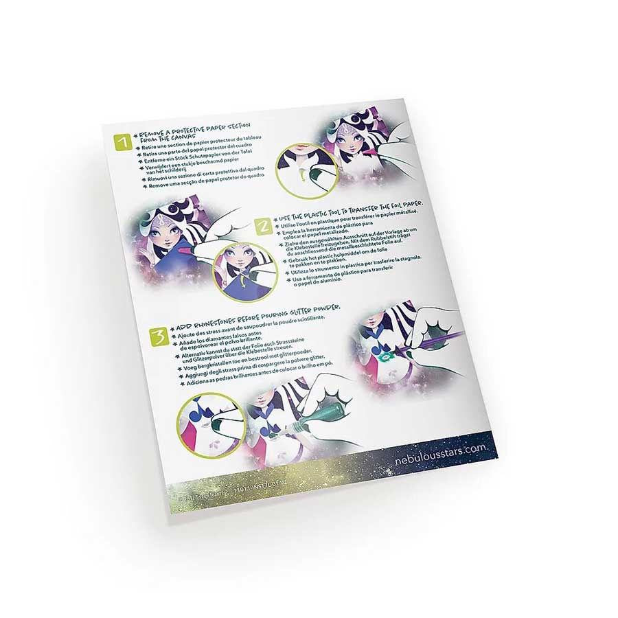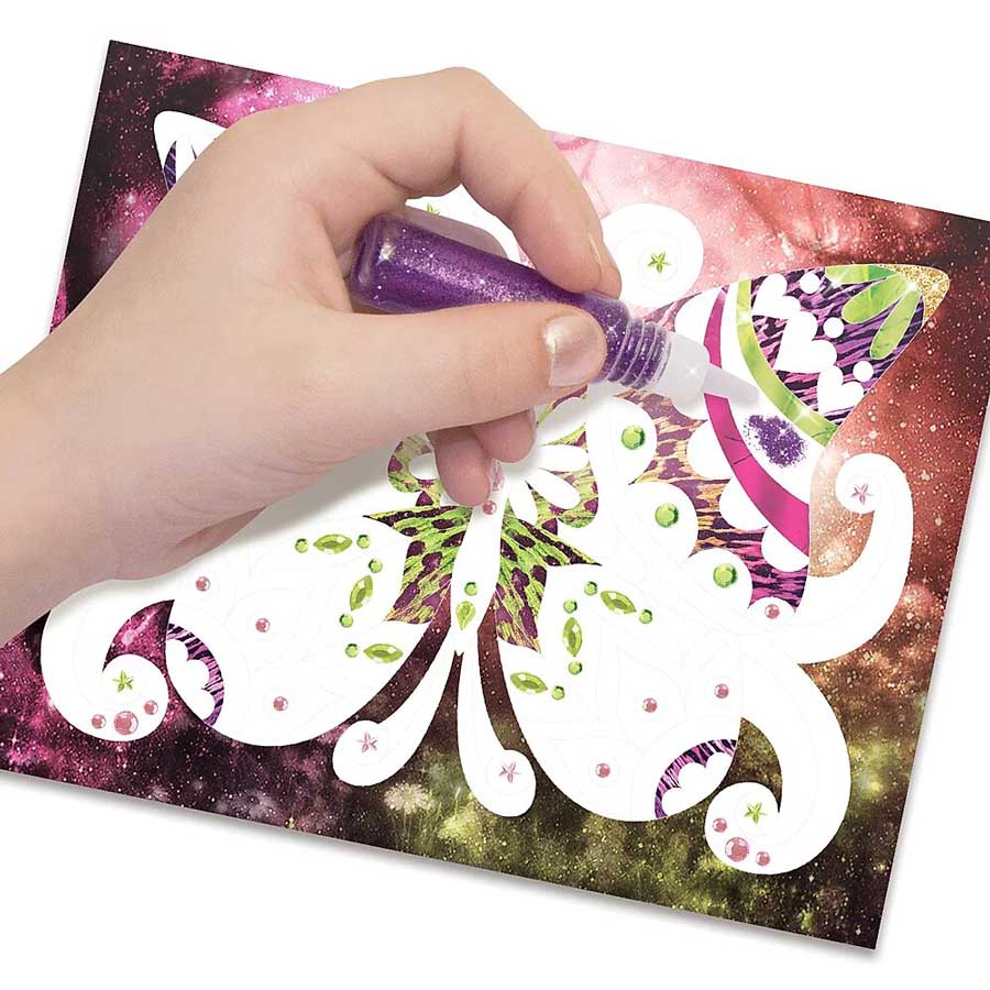 Crée des chefs-d’œuvre étincelants avec une méthode simple et efficace. Retire la pièce pré-coupée pour décorer chaque partie avec un papier métallisé, de la poudre scintillante et des strass.