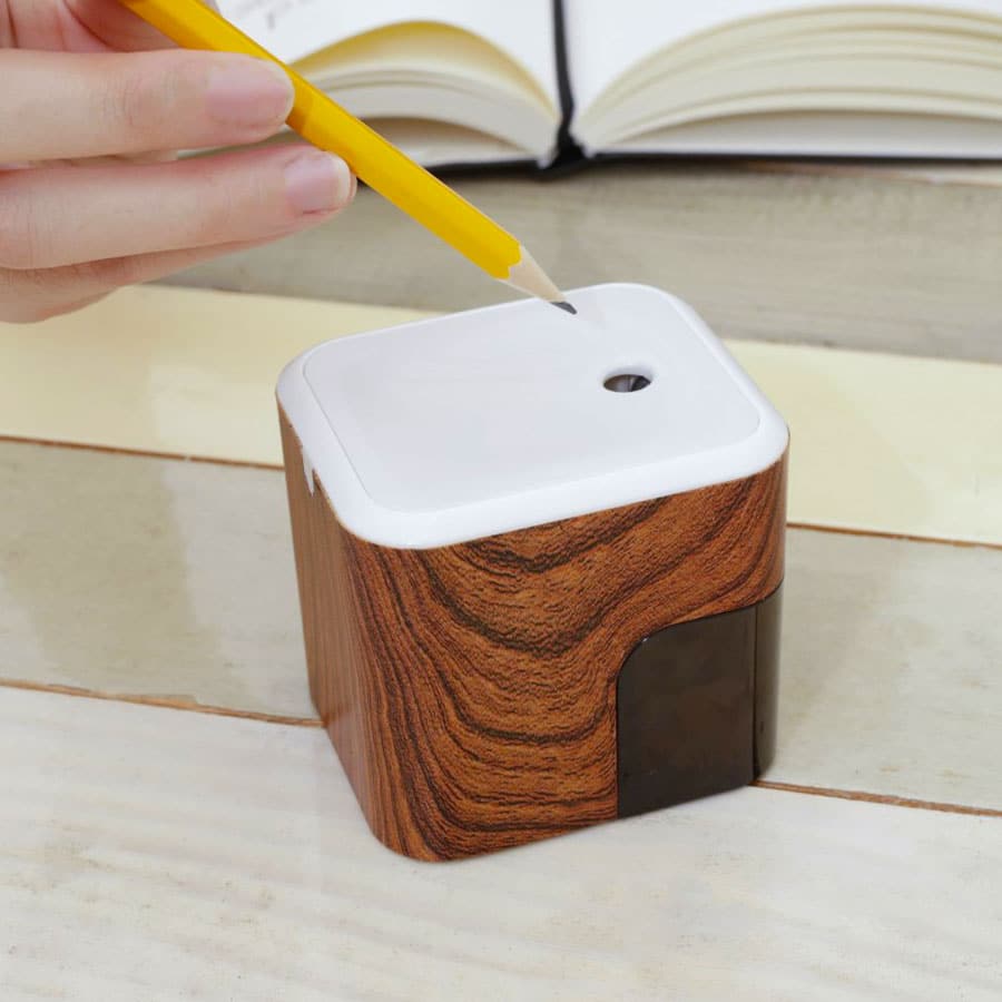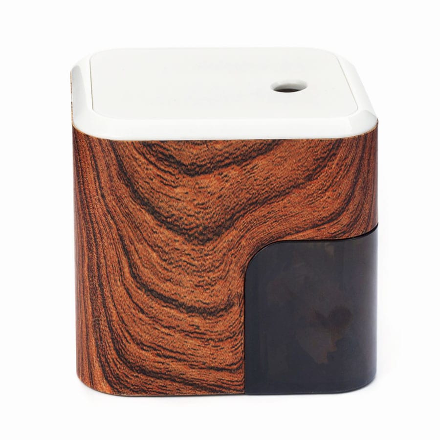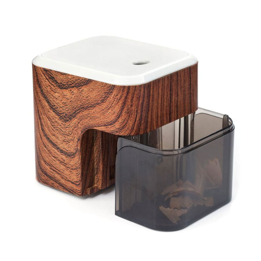 Ce taille-crayon électrique de style rétro de Kikkerland est un accessoire de style pour votre bureau ou votre maison. Le taille-crayon a une finition en motif de bois, un trou anti-poussière, un plateau à copeaux amovible et un moteur à faible bruit.
