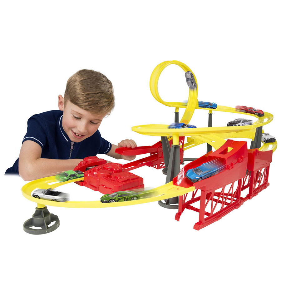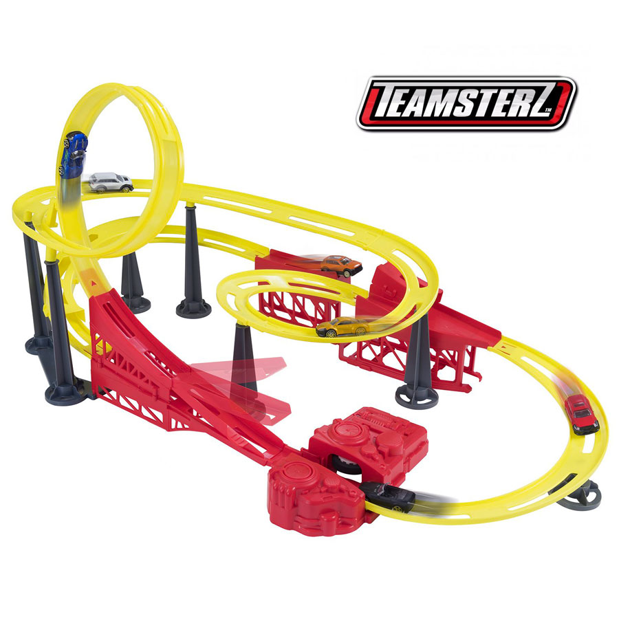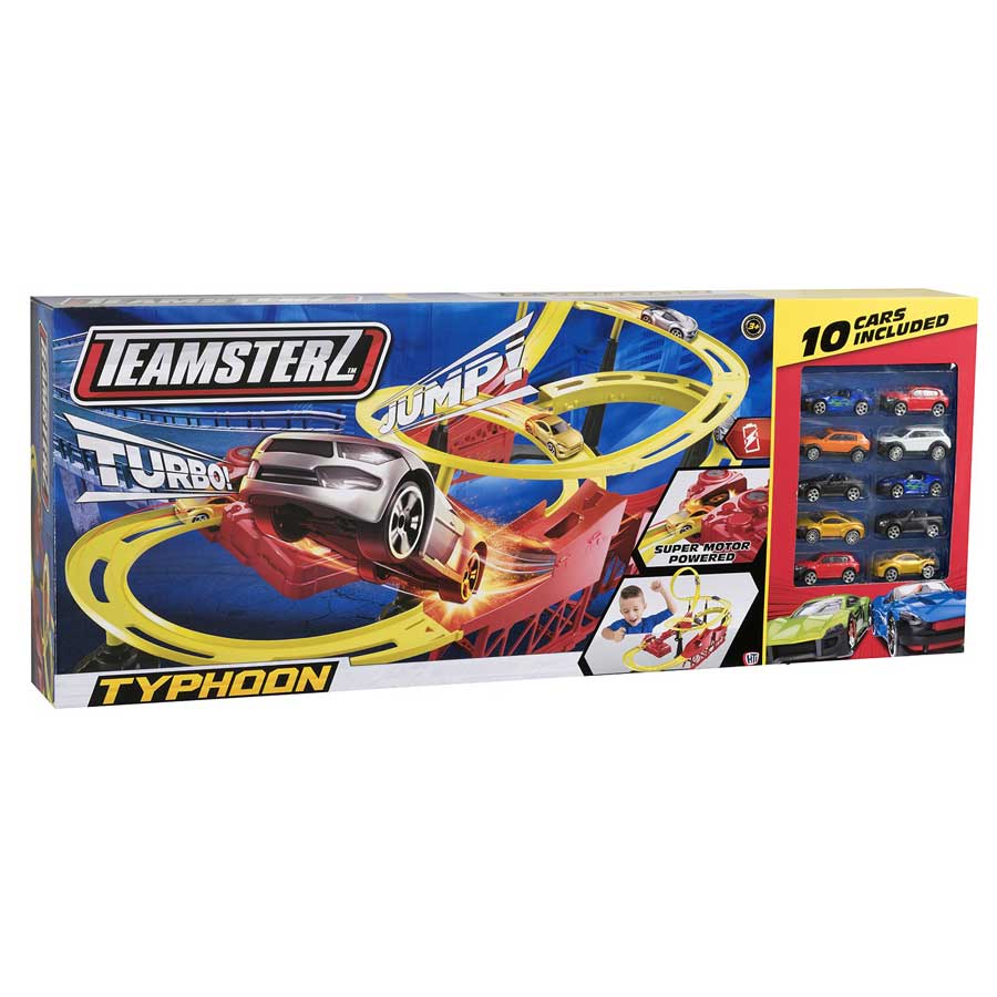 Un circuit super propulsé à plusieurs niveaux avec une boucle morte et un turbo tremplin. Les voitures sont propulsées à partir d’un dispositif de démarrage motorisé et vous pouvez choisir où votre voiture ira : vers une boucle morte ou à un tremplin. Comprend 10 voitures de course différentes. Compatible avec toutes les pistes Teamsterz!
