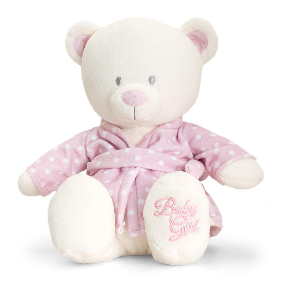 Parfait pour un câlin au coucher; cet ours de chambre de 25 cm est prêt pour le lit avec sa robe de chambre pastel. Un complément idéal à la crèche ou au berceau pour le compagnon de sommeil de bébé.