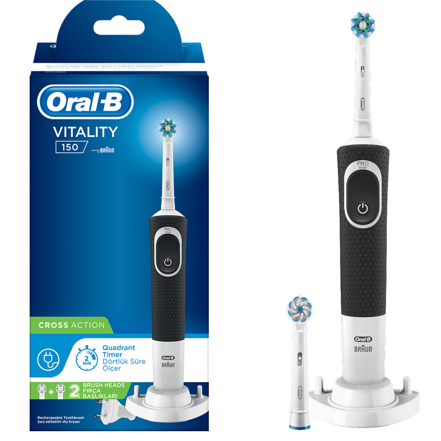 Il a été prouvé cliniquement que la brosse à dents électrique rechargeable Oral-B Vitality 150 Cross Action nettoie plus efficacement qu’une brosse à dents manuelle classique. Le design de la brossette CrossAction permet d’entourer chaque dent grâce aux poils positionnés à un angle de 16 degrés. Son action de nettoyage 2D associe oscillations et rotations pour une élimination de la plaque dentaire plus efficace par rapport à une brosse à dents manuelle classique. Le minuteur intégré au manche vous aide à respecter le temps de brossage de 2 minutes recommandé par les dentistes. Ce produit est conçu par Oral-B, la marque de brosse à dents la plus utilisée par les dentistes eux-mêmes dans le monde.